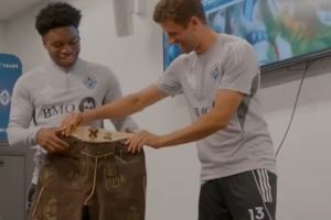 体育资讯8月16日讯 温哥华白浪晒出视频,穆勒给为自己让出号码的队友普里索送了巴伐利亚传统服饰。